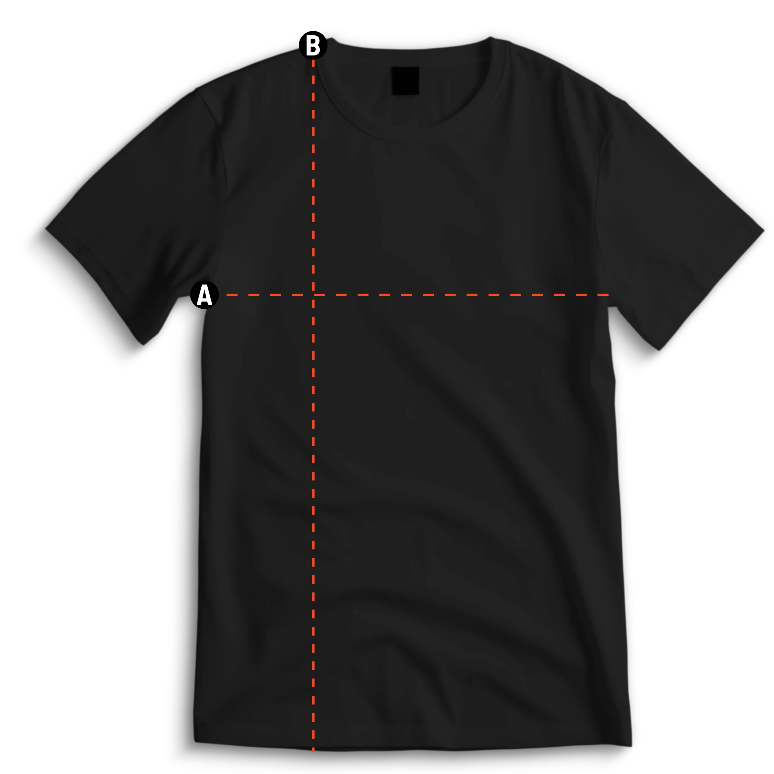 • Measurement A: Place your measuring tape at the point where your sleeve makes contact with the body of the t-shirt and measure to the other side